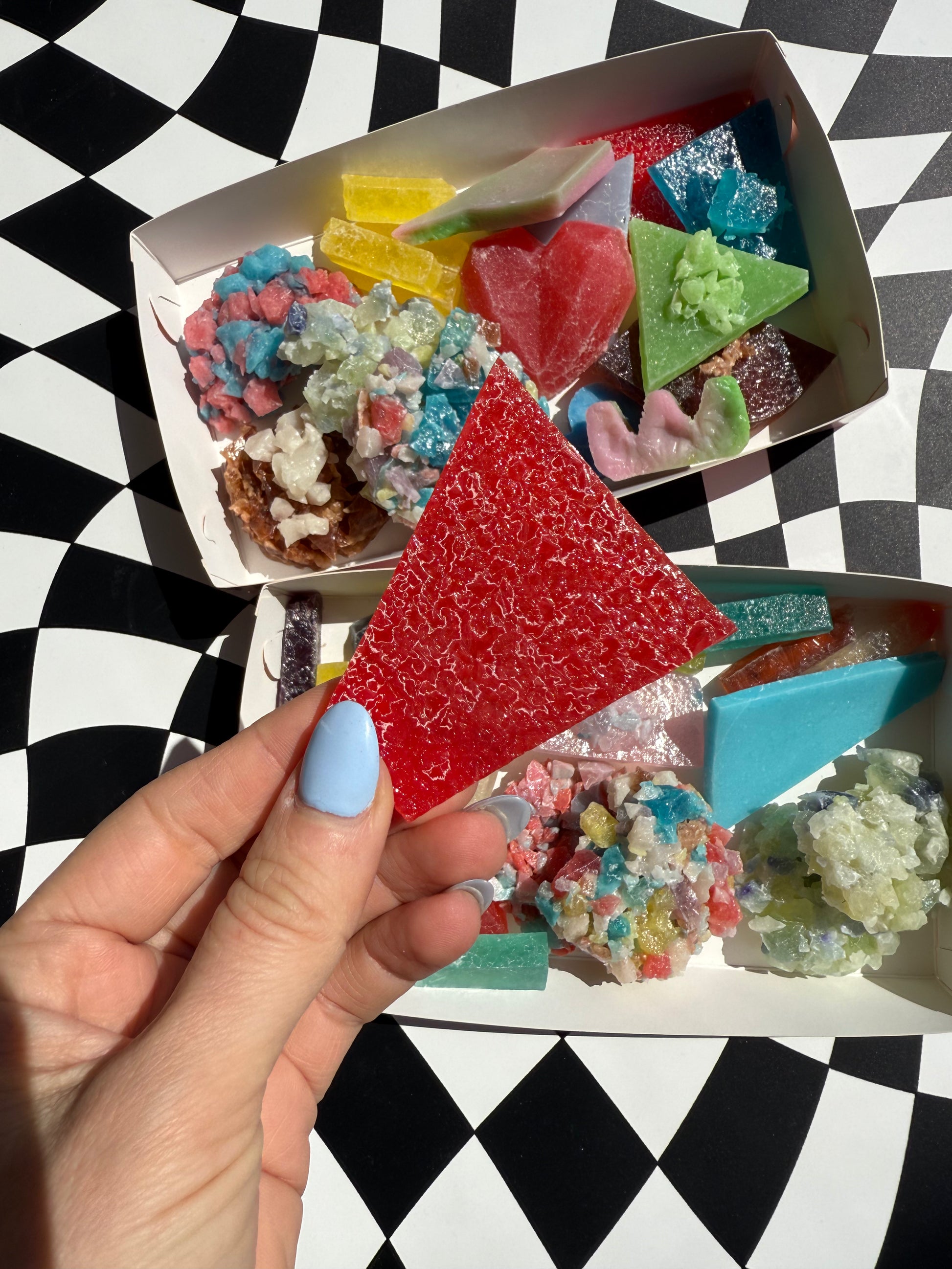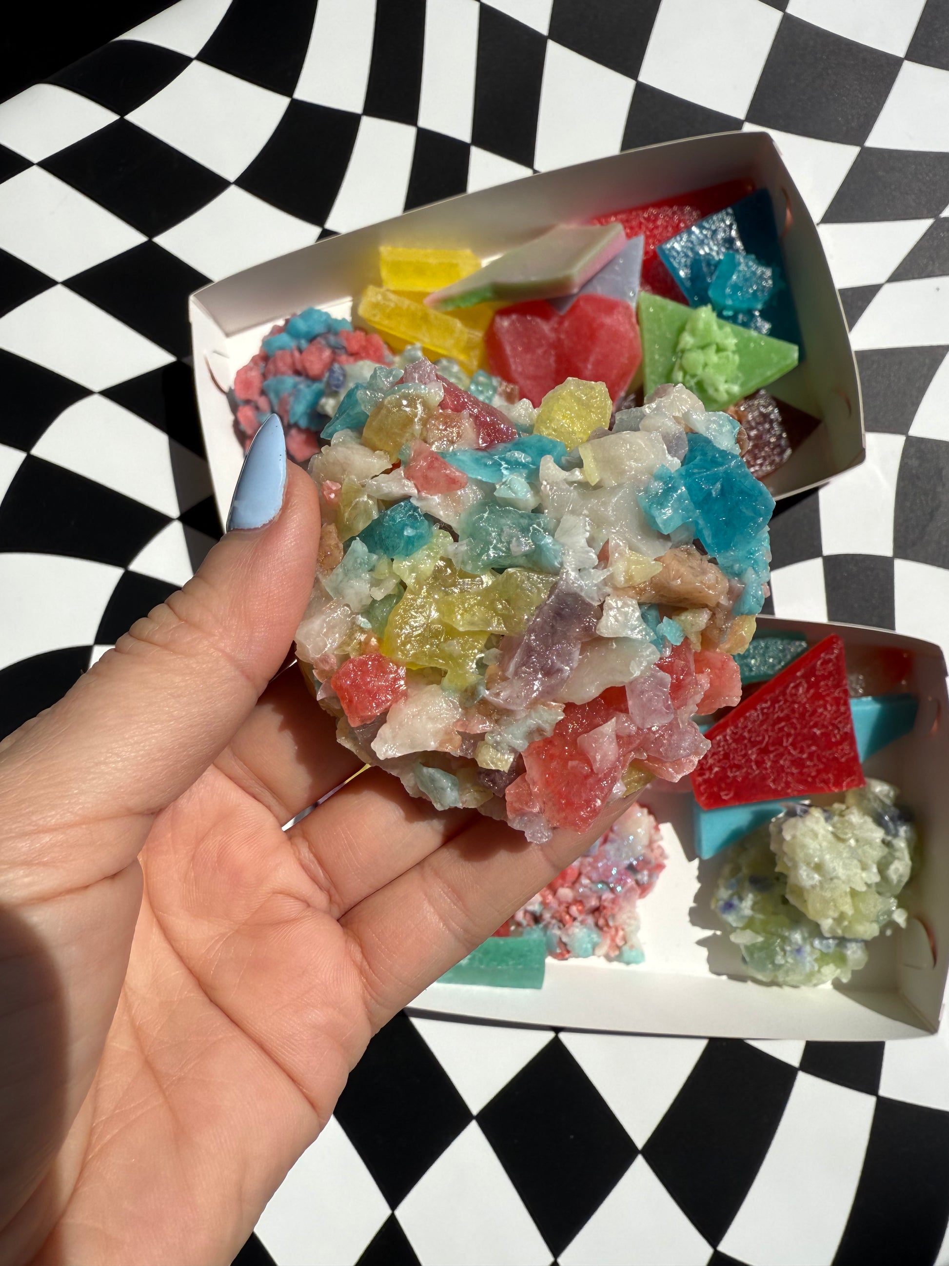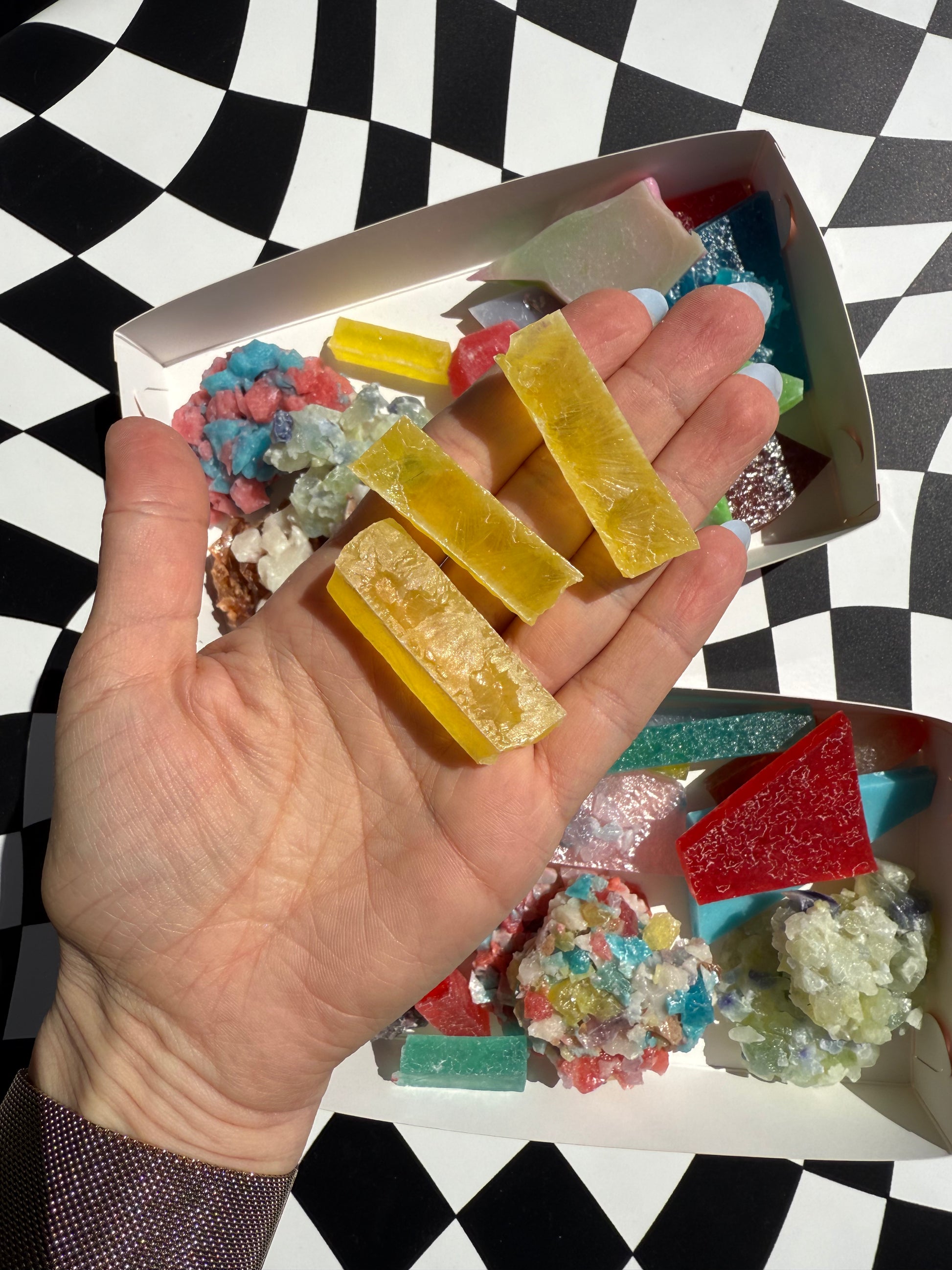 Inside each box you’ll find 10–15 mixed pieces — think crystals, clusters, stix, and more. Some might be a little broken, some clusters aren’t quite round, and a few may have developed a white “sugar bloom” (a natural quirk of candy-making). But don’t worry — every single piece is still safe to eat and full of flavour.